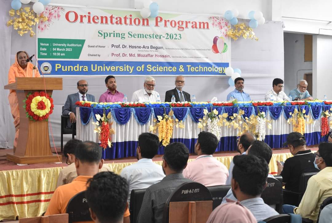 উত্তর জনপদের কৃতি সন্তান দেশের সমাজ পরিবর্তন ও নারী উন্নয়নের অগ্রদূত অধ্যাপিকা ড.হোসনে আরা বেগম প্রতিষ্ঠিত দেশের শীর্ষ স্থানীয় ও জাতীয় পর্যায়ের এনজিও টিএমএসএসের আওতাধীন পরিচালিত বগুড়ার পুন্ড্র ইউনিভার্সিটি অব সায়েন্স এন্ড টেকনোলজির ২০২৩ সালের স্প্রিং সেমিস্টারে ভর্তিকৃত শিক্ষার্থীদের ওরিয়েন্টেশন প্রোগ্রাম ৪ মার্চ পুন্ড্র বিশ্ববিদ্যালয়ের অডিটোরিয়াম হল রুমে অনুষ্ঠিত হয় বিশ্ববিদ্যালয়ের উপাচার্য প্রফেসর ড.মোঃ মোজাফফর হোসেন এর সভাপতিত্বে অনুষ্ঠানে উপস্থিত থেকে শিক্ষক,শিক্ষার্থীদের উদ্দেশ্যে গুরুত্বপূর্ণ ও দিক নির্দেশনা মূলক বক্তব্য দেন পুন্ড্র বিশ্ববিদ্যালয়ের বোর্ড অব ট্রাস্টিজের চেয়ারম্যান, টিএমএসএসের প্রতিষ্ঠাতা নির্বাহী পরিচালক ও আনসার ভিডিপি উন্নয়ন ব্যাংকের পরিচালক অধ্যাপিকা ড.হোসনে-আরা বেগম।অনুষ্ঠানে বিশেষ অতিথির বক্তব্য টিএমএসএসের উপনির্বাহী পরিচালক ও বিশ্ববিদ্যালয়ের বোর্ড অব ট্রাস্টিজের ভাইস চেয়ারম্যান রোটারিয়ান ডাঃ মোঃ মতিউর রহমান,টিএমএসএসের হেম সেক্টরের উপদেষ্টা ও বোর্ড সদস্য আয়শা বেগম প্রমুখ। অনুষ্ঠানে অন্যদের মধ্যে রাজশাহী বিশ্ববিদ্যালয়ের ইঞ্জিনিয়ারিং অনুষদের সাবেক ডিন প্রফেসর ড.একরামুল হামিদ, বিশ্ববিদ্যালয়ের ট্রেজারার প্রফেসর মোঃ সুজন শাহ-ই-ফজলুল,বিজ্ঞান ও প্রকৌশল অনুষদের ডিন প্রফেসর ড.খাজা জাকারিয়া আহ্মদ চিশ্তী ও মানবিক ও সামাজিক বিজ্ঞান অনুষদের ডিন মাহমুদ হাসান চৌধুরী।অনুষ্ঠানে স্বাগত বক্তব্য দেন বিশ্ববিদ্যালয়ের ভারপ্রাপ্ত রেজিস্ট্রার ড.মোঃ আলাউদ্দিন। তিনি তাঁর স্বাগত বক্তব্যে বিশ্ববিদ্যালয়ের পরিচিতি ও সার্বিক বিষয় উপস্থাপন করেন।অধ্যাপিকা ড.হোসনে আরা বেগম উপস্থিত সবাইকে শুভেচ্ছা ও স্বাগতম জানান।তিনি বলেন,টিএমএসএস লাভের আশায় নহে,সেবার মানষিকা নিয়ে কাজ করছে।তিনি আরো বলেন দেশের তৃণমূলে টিএমএসএস বিভিন্ন সামাজিক ও মানবিক কর্মকান্ড পরিচালনা করছে।তিনি বলেন টিএমএসএস সারা দেশেস্বাস্থ্য,শিক্ষা,কৃষি,মৎস্য,প্রাকৃতিক সম্পদের সুষ্ঠু ব্যবহার সহ সকল সামাজিক কার্যক্রম পরিচালনা অব্যাহত রয়েছে।অনুষ্ঠানে উপস্থিত নবাগত শিক্ষার্থীদের ফুল ও উপহার সামগ্রী দিয়ে বরণ করে নেওয়া হয় ও শিক্ষার্থীদের মানবিক গুণের অধিকারী হয়ে স্মাট মানুষ হিসাবে দেশ ও জাতির সেবায় নিজেকে নিয়োজিত করার তাগিদ দেওয়া হয়।অনুষ্ঠানে বিশ্ববিদ্যালয়ের সকল শিক্ষক,শিক্ষার্থী,টিএমএসএসের উপদেষ্টা,পরামর্শক,নির্বাহী পরিচালকের একান্ত সচিব মোঃ ফেরদৌস রহমান,বিভিন্ন কর্মকর্তা,নানা শ্রেণি পেশার প্রতিনিধি,রাজনৈতিক নেতৃবৃন্দ,এনজিও কর্মী,ইলেকট্রনিক ও প্রিন্ট মিডিয়ার প্রতিনিধি উপস্থিত ছিলেন।